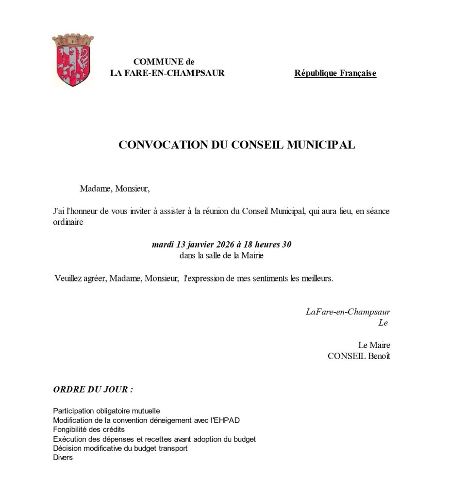 Conseil municipal le mardi 13 janvier 2026