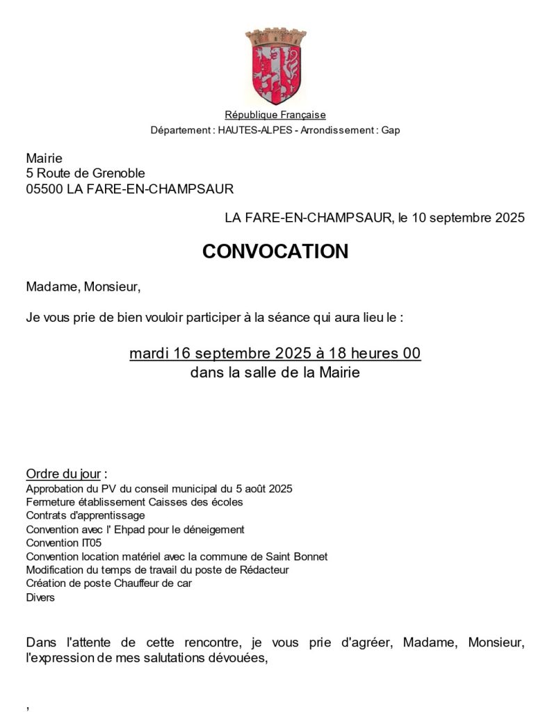 Voici l’ordre du jour du prochain conseil municipal, mardi 16 septembre à 18h :