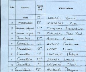 La Feuille de proclamation, et le Tableau du Conseil Municipal (extrait ci-dessous) sont affichés à la porte de la Mairie.