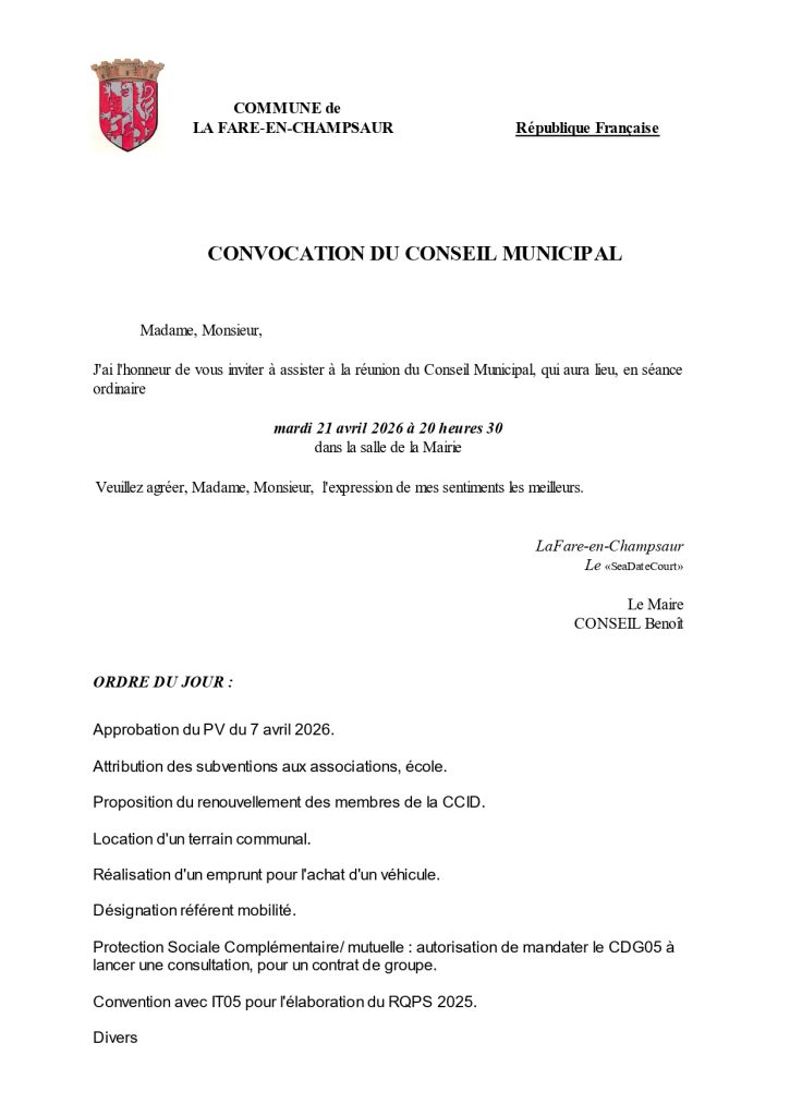 Le prochain conseil municipal se tiendra le mardi 21 avril 2026 à 20h30