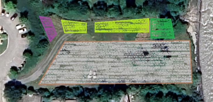 Photo 2 : plan d’implantation des jardins (en violet, jaune et vert). Vue aérienne : à gauche le “parking Napoléon”, à droite le Drac, en haut le ruisseau !